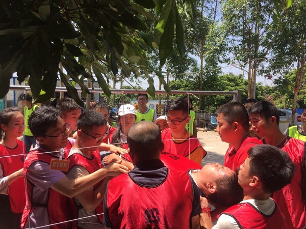 經(jīng)過短暫的午休后,團隊進入了第四個項目“同心鼓”,一人墜球,其他人握繩顛球,領先完成20個顛球的隊伍為勝。從一開始的手忙腳亂,在游戲過程中不斷取長補短,團結合作,到最后步驟一致,共同為了完成目標而努力。所有成員在團隊中找到自己的價值,發(fā)揮自己的作用,同時也學會聆聽他人,配合他人,關愛他人。