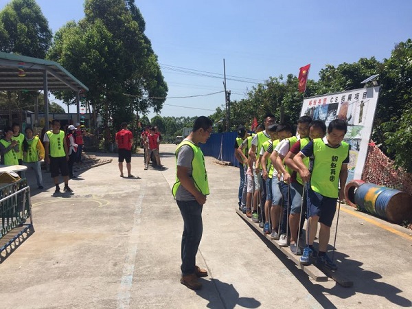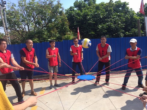 團隊在當天上午9點半左右到達目的地,經(jīng)過短暫的休息后,進行了分組團隊建設及熱身小活動。緊接著,作為活動的第一個項目“無軌列車”隆重登場了,本項目要求團隊成員雙腳分別站在兩塊長約5~8米,安裝有10個提繩的長條木板上并手握提繩,行走一定的距離。由于剛開始大家沒有找到項目的技巧,舉步難行,兩隊都是東倒西歪,經(jīng)過磨合溝通后,最終順利地完成了比賽。該項目提升了團隊激情及凝聚力。