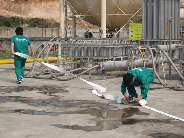 15:30分,隨著生產(chǎn)部報(bào)警聲響起,LNG灌區(qū)發(fā)生泄漏,現(xiàn)場指揮接警后立即按響報(bào)警器,指揮相關(guān)小組啟動(dòng)消防水泵,對灌區(qū)進(jìn)行緊急噴淋,隔離相鄰儲罐,并組織員工按預(yù)定區(qū)域到達(dá)避難位置。市消防派出2輛高噴消防車、6輛水罐消防車到達(dá)起火現(xiàn)場,火情偵檢組隨即展開偵檢,先用泄露儀對現(xiàn)場進(jìn)行濃度檢測,并用隔離帶劃出相應(yīng)的警戒線,保安配合警戒組疏散區(qū)域內(nèi)無關(guān)人員及在場使用中的車輛熄火,同時(shí)關(guān)閉大門,禁止除消防車、搶險(xiǎn)車外的一切車輛出入。在得知了著火位置和泄漏程度后,中隊(duì)指揮員立即下令,展開滅火行動(dòng)。消防隊(duì)員穿上消防戰(zhàn)斗服、佩戴防毒面具和呼吸器、攜帶銅質(zhì)工具和滅火器材迅速趕往事故儲罐,關(guān)閉儲罐根部所有閥門。而其余消防車按照預(yù)期指定位置,全方位對LNG灌體進(jìn)行火災(zāi)撲救。