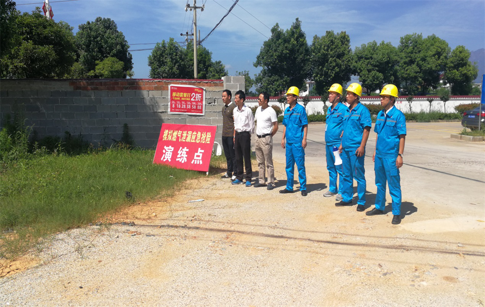 上午9:30 ,公司客服部接到宜居小區(qū)居民報警說附近燃?xì)夤艿辣皇┕C(jī)械挖破泄漏著火后,客服部立即上報公司安全運(yùn)營部經(jīng)理和公司總經(jīng)理,并立即撥打119進(jìn)行報警。總經(jīng)理立即通知啟動一級應(yīng)急搶險預(yù)案。接到通知后,巡線人員第一時間趕到事故現(xiàn)場查看,立即對泄漏點(diǎn)周圍進(jìn)行燃?xì)鉂舛葯z測,劃定警戒范圍,警戒小組拉上警戒帶隔離疏散人群。消防大隊接到報警后,立即派出兩臺消防車趕赴現(xiàn)場并拉響警報。消防車在公司員工的引導(dǎo)下停在警戒線以外,消防員持消防水槍立即前往著火點(diǎn)附近搶占有利位置噴灑水霧稀釋燃?xì)?,巡線員接到指令關(guān)閉管道上下游閥門、泄漏點(diǎn)樓棟調(diào)壓箱,閥門關(guān)閉后,隨著火勢減小,消防隊員將火滅掉;在泄漏燃?xì)馐艿娇刂坪?,防爆軸流風(fēng)機(jī)啟動進(jìn)一步吹散降低現(xiàn)場燃?xì)鉂舛?,檢測人員檢測燃?xì)鉂舛冗_(dá)到安全范圍值,通知搶險施工班組進(jìn)場對受損管道進(jìn)行修復(fù)、檢驗。修復(fù)完成后,巡線組對管道進(jìn)行置換,按指令恢復(fù)小區(qū)供氣,檢測人員再次對周邊環(huán)境進(jìn)行檢測,確認(rèn)正常,解除現(xiàn)場警戒。 隨后公司總經(jīng)理蘭書彬及建設(shè)局領(lǐng)導(dǎo)曾彬輝對演練進(jìn)行了總結(jié)和點(diǎn)評。